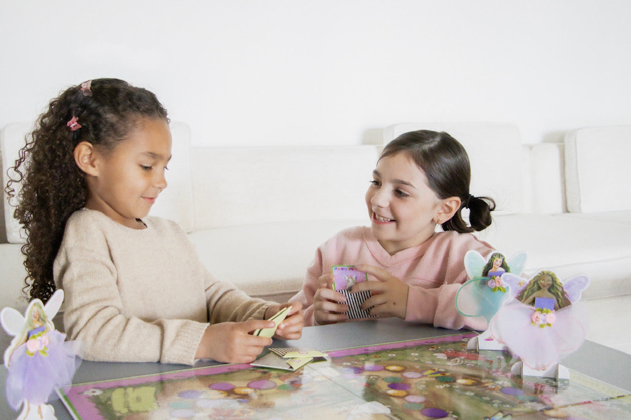 A Magical Fairy Board Game designed for ages 5+. The game includes 4 paperdoll fairies, 4 dresses, 1 wand, 1 fairy game board, fairy notecards, tokens, and playcards. Instructions are included.